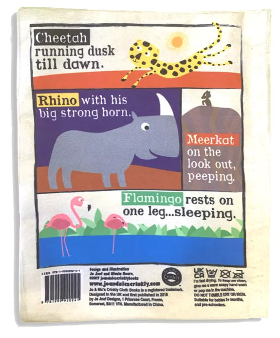 Nursery Times Crinkly Newspaper. Safari Animals. 6 pages of beautiful illustrations and simple rhyming text about favourite safari park animals. UKCA/CE tested and machine washable. A practical, lightweight cloth book with crinkly pages. A great sensory toy. A unique gift. Each newspaper is packed in a gifting envelope to add 'To' and 'From' and a short message.